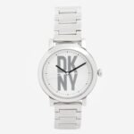 DKNY’s 34mm Soho D watch features a white sunray dial and silver tonal logo, three-hand movement and stainless steel bracelet.