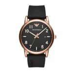 Everyday elegance from Emporio Armani, with the modern man in mind. A classic black dial boasts a bold and clear-cut display of arabic numeral and baton indexes, three-hand movement and date window for increased efficiency. The signature Emporio Armani eagle sits at the head of the dial, co-ordinating with the luxe rose gold tone case housing the timepiece upon a versatile black rubber strap. Minimal, modish style to suit every wrist at every occasion.