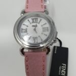Silver-tone stainless steel case with a leather strap. Fixed stainless steel bezel. Mother of pearl dial with silvertone hands and index-Roman numerals hour markers. Dial Type: Analog. Quartz movement. Scratch resistant sapphire crystal. Pull / push crown. Stainless steel case back. Round case shape, case size: 38 mm, case thickness: 7.5 mm. Band width: 18 mm, band length: 7 inches. Water resistant at 50 meters / 165 feet. Functions: hour, minute. Dress watch style. Watch label: Swiss Made. Fendi Selleria Mother of Pearl Dial Ladies Watch