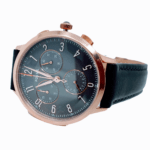 Rose gold-tone stainless steel case with a grey leather strap. Fixed rose gold-tone bezel. Gunmetal dial with rose gold-tone hands and Arabic numeral hour markers. Minute markers around the outer rim. Dial Type: Analog. Chronograph – two sub-dials displaying: 60 second and 30 minute. Date sub-dial at the 6 o’clock position. Quartz movement. Scratch resistant mineral crystal. Pull / push crown. Solid case back. Case size: 34 mm. Case thickness: 9 mm. Round case shape. Band width: 16 mm. Band length: 7 inches. Tang clasp. Water resistant at 30 meters / 100 feet. Functions: chronograph, date, hour, minute, second. Additional Info: in general, withstands splashes or brief immersion in water, but not suitable for swimming or bathing. Casual watch style. Fossil Abilene Chronograph Gunmetal Dial Ladies Watch CH3099.