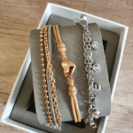 Set Member 1 Description:Â Rose Gold Heart Bracelet: Closure: Slider Primary Colour: Rose Gold Material: Leather, Stainless Steel Measurements: 216mm Tri-Tone Bracelet: Closure: Lobster Clasp Primary Colour: Tri-Tone Material: Beaded, Leather, brass Measurements: 6.5″ +1″ Glitz Bracelet: Closure: Spring Ring Primary Colour: Silver Material: Stainless Steel Measurements: 6.5″ + 1″