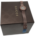 Brown PVD stainless steel case with a brown PVD stainless steel mesh bracelet. Fixed brown PVD bezel with a brown PVD mesh inlay. Brown dial with silver-tone hands. No markers. Dial Type: Analog. Quartz movement. Scratch resistant sapphire crystal. Pull / push crown. Solid case back. Case size: 29 mm. Case thickness: 7.3 mm. Round case shape. Band width: 12 mm. Slip through clasp. Water resistant at 30 meters / 100 feet. Functions: hour, minute. Additional Info: withstands rain and splashes of water, but not showering or submersion. Dress watch style. Watch label: Swiss Made. Gucci U-Play Brown Dial PVD Stainless Steel Ladies Watch YA129520.