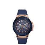 A blue smooth silicone strap GUESS watch featuring a brushed and polished rose gold case with a blue top ring and a blue multifunctional sunray dial.