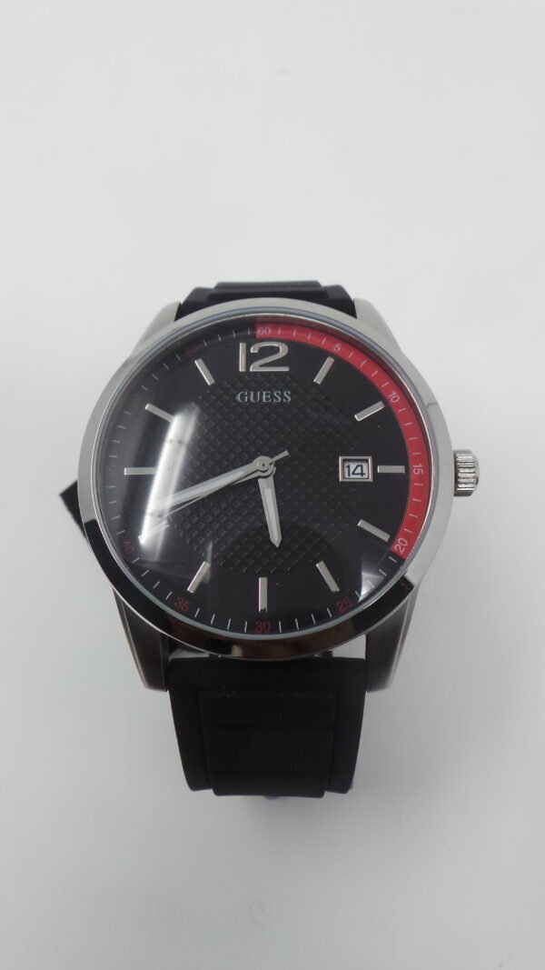 GUESS Gents watch featuring a brushed and polished silver case with sunray black date dial with red detailing and black textured silicone strap.