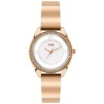 The STORM ‘Mini Pizaz’ is a glamourous watch with sparkling Swarovski crystals set around the edge of the entire watch case. This watch has a highly polished gold strap made from 21 karat rose gold plated stainless steel and a unique clear glass case back.
