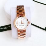 White dial enhanced by rose gold-tone hands. Rose Gold PVD stainless steel case with a rose gold pvd stainless steel band. Quartz movement. 30 meters / 100 feet water resistance. Fixed bezel. Scratch Resistant Mineral crystal. Solid caseback. Fold Over with Push Button Release clasp. Pull / Push crown. Case size 32 mm. Band 16 mm x long. Marc Jacobs MJ0120198990 The Round Watch.