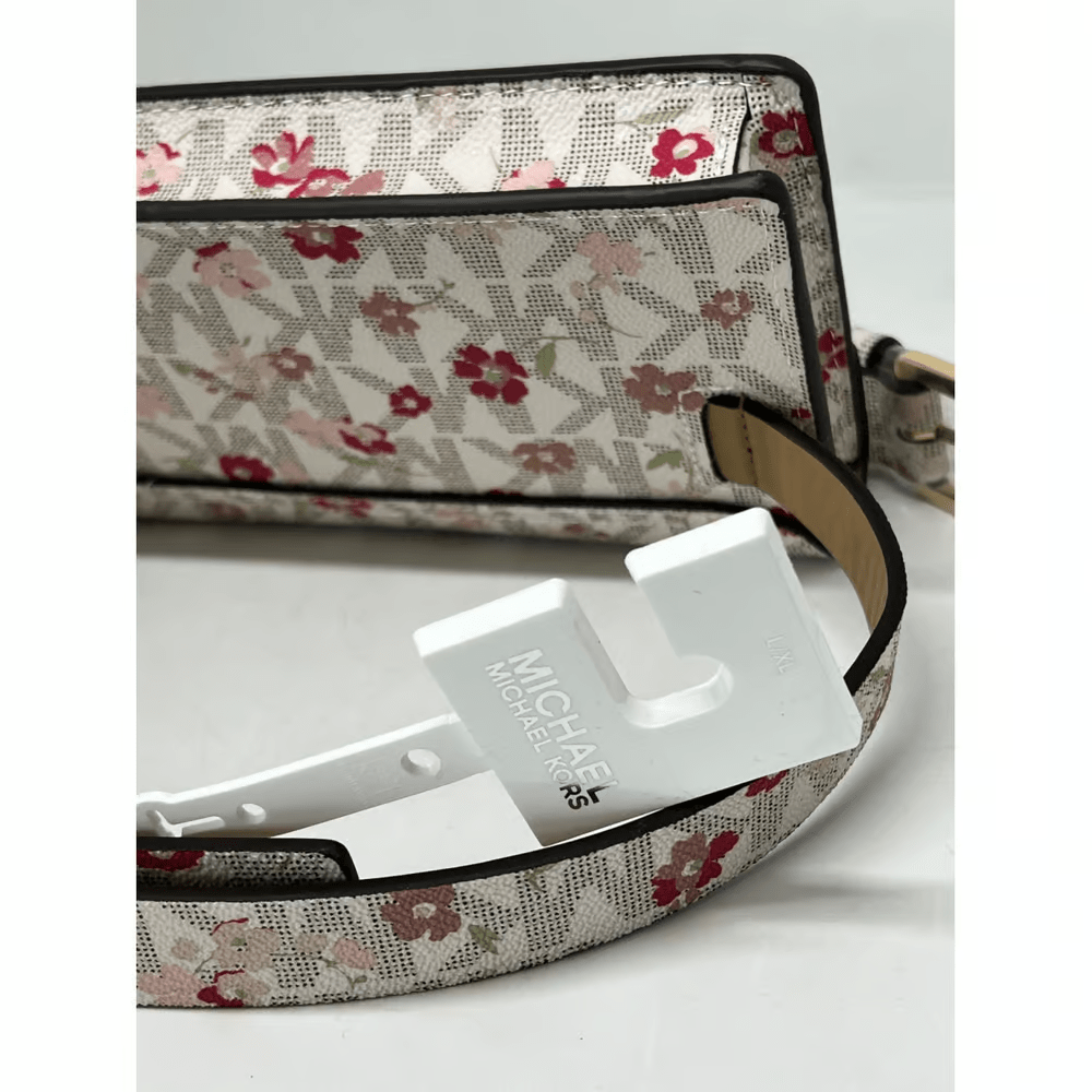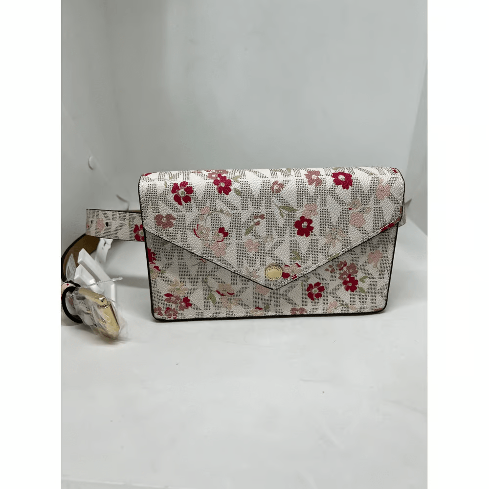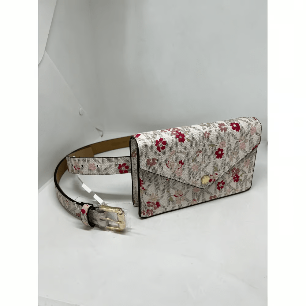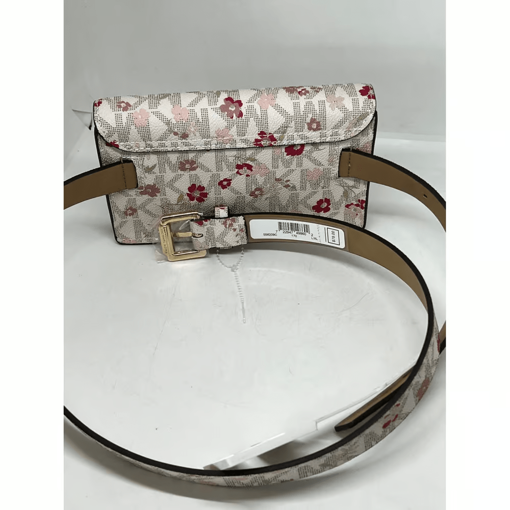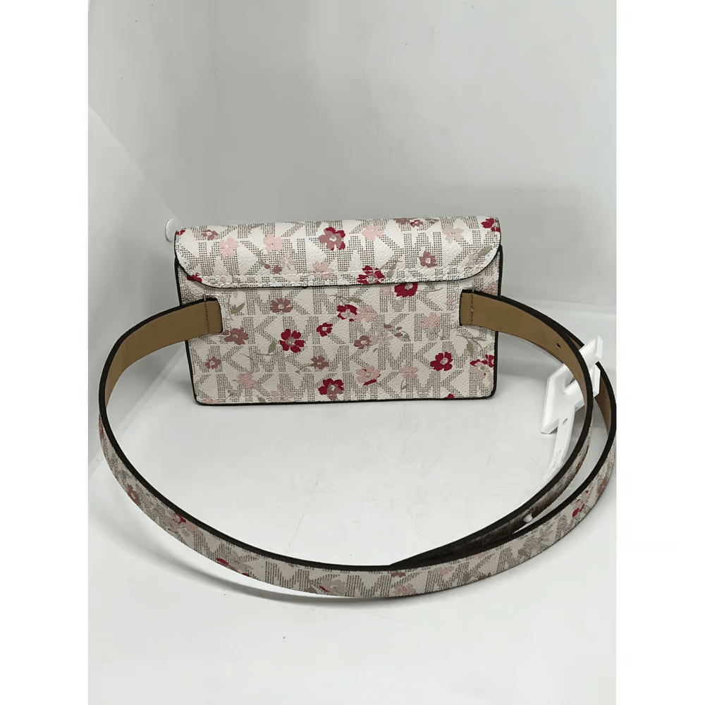 Floral and logo print – magnetic front closure – belt waist fanny pack style bag with adjustable buckle closure – synthetic material – color: pink, mauve, tan, brown, and cream