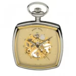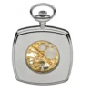 A unique squared-face chrome plated open face pocket watch with a gold-plated edge. This model has markings and numerals on a gold coloured dial with visual skeletal display. It also has 60 second markings and unusual black and white hands. This pocket watch comes with Chrome chain, presentation box, and 2 year guarantee.