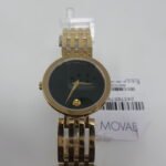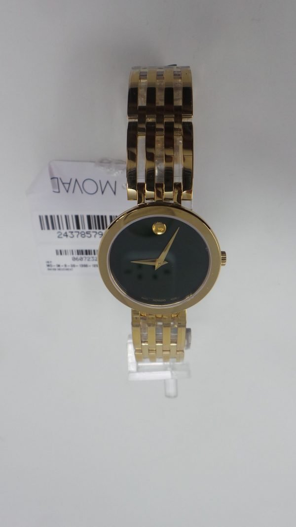 This Movado watch has a gold-coated stainless steel case 28mm in diameter and is fitted with a metal strap. Inside the case lies a movement and the watch features a sapphire crystal. The watch is 3ATM. This means the watch is splash waterproof.