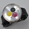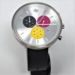 A bright and crisp ladies chronograph watch in radial stainless steel with coloured sub dial. A straight-cut 316L grade stainless steel case is measured by embossed silver hour markers on a spun aluminium dial. With a triptych of chronograph sub dials in pink, black and yellow offering a 60 second timer, 30 minute stopwatch and 24 hour indicator alongside date function. Includes both an interchangeable black leather and striped multi-color canvas strap. Jim Read’s latest watch design takes its name from his grandfather. Eddie Read was an important player in radio technology for the British secret service. He was fluent in Morse Code and a staunch HAM radio fanatic, his call sign was ‘G6US’ which Jim has used to autograph the new collection in honour of Eddie and as a thank you for his influence over Jim’s early interest in gadgets and instrumentation that ultimately led to him making clocks and watches. There is a ladies collection G6S, and men’s collection G6. Both come with interchangeable straps, one made from fine black Italian leather and the other made from Newgate’s colourful loom woven canvas. Each watch also includes the new acrylic table stand to display your G6. With the G6 Jim wanted to create a recognisable new style. 2 years warranty