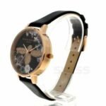 Rose gold ion-plated stainless steel case with a black leather strap. Fixed rose gold ion-plated bezel. Black (embroided 3d bee motif) dial with rose gold-tone hands. No markers. Dial Type: Analog. Quartz movement. Scratch resistant mineral crystal. Pull / push crown. Solid case back. Round case shape. Case size: 38 mm. Case thickness: 8 mm. Band width: 12 mm. Tang clasp. Water resistant at 10 meters / 33 feet. Functions: hour, minute, second. Dress watch style. Watch label: Japan Movt. Olivia Burton 3D Bee Embroidered Black Dial Ladies Watch OB16EM02.