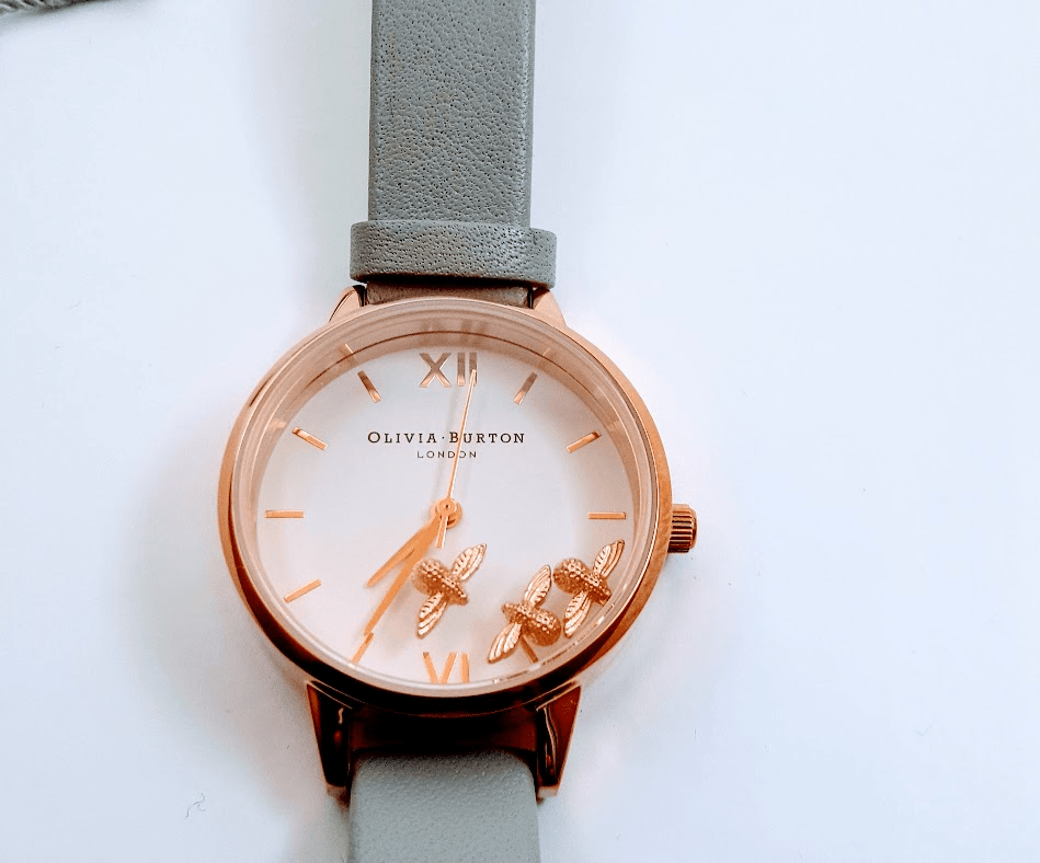 ● Case diameter: 30 mm ● Case: Stainless steel IP rose gold ● Bracelet material: leather gray ● Dial: White with rose gold bees, Roman numerals, indices and hands ● Water resistance: 1 bar