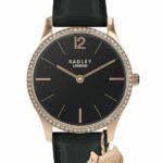 Radley womens watch with 35mm rose gold plated stainless steel stone set casing, 3-hand analogue display, black dial, and black leather strap with traditional buckle fastening.