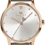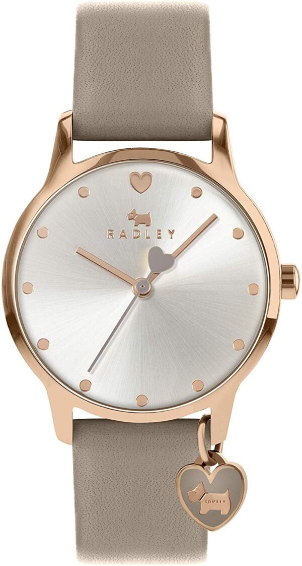 This ladies watch from Radley London features a round rose gold case, with a pale silver sunray dial and the brands iconic dog logo. Completed with a mink grey coloured soft leather strap and heart shaped charm. The watch is 30m water resistant.