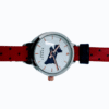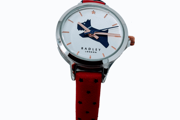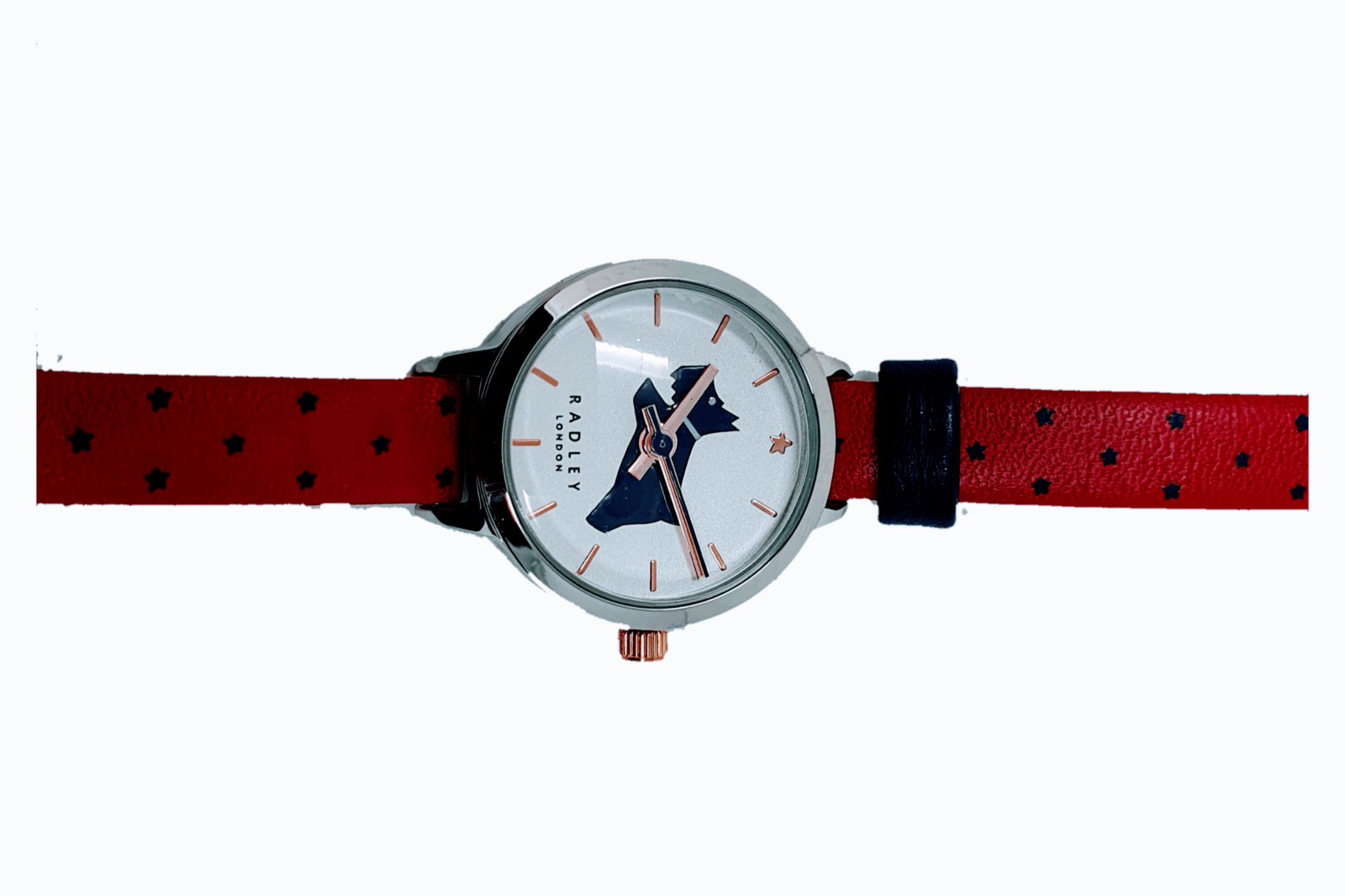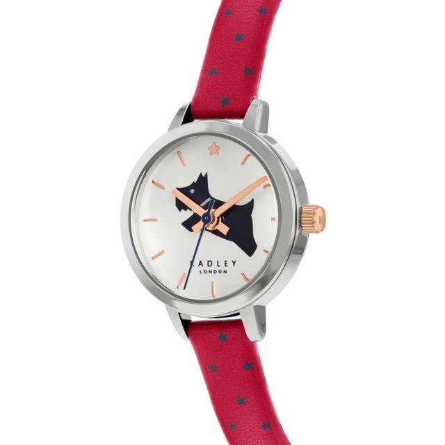 This ladies watch from British brand Radley London features a round silver case, with a pale silver sunray dial and the brands iconic dog logo. Completed with a raspberry coloured soft leather strap with blue star detail. The watch is 30m water resistant