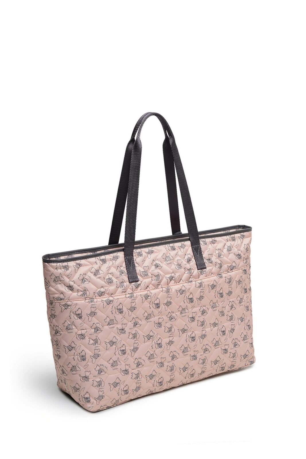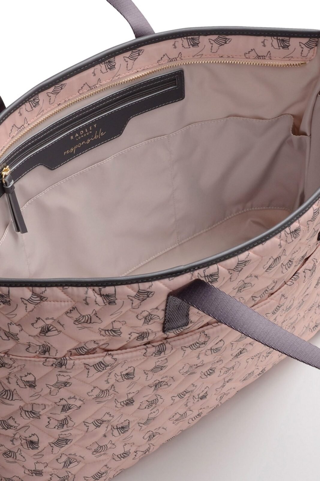 This large tote is from the Maple Cross Signature Quilt collection. And it s made from plastic bottles. That s because it s part of the Radley Responsible range. Where sustainable materials meet love-forever shapes. It s also lightweight and fitted with an internal laptop sleeve. Daily commute: sorted. Featuring contrast water-based PU trims, Radley Geo quilted exterior, Scottie dog print, slip back pockets, twin webbing grab handles, zip fastening, recycled polyester lining, internal sleeve for 15 laptop, internal zip and slip pockets, foil-embossed Radley London logo and detachable Scottie dog key fob.