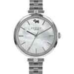 Radley womens watch with stainless steel silver casing, 34mm mother of pearl dial, 3-hand analogue display, and silver bracelet strap with deployment fastening.