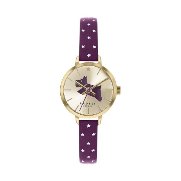 This ladies watch from British brand Radley London features a round pale gold case, with a pale cream sunray dial and the brands iconic dog logo. Completed with a purple soft leather strap with cream star detail. The watch is 30m water resistant.