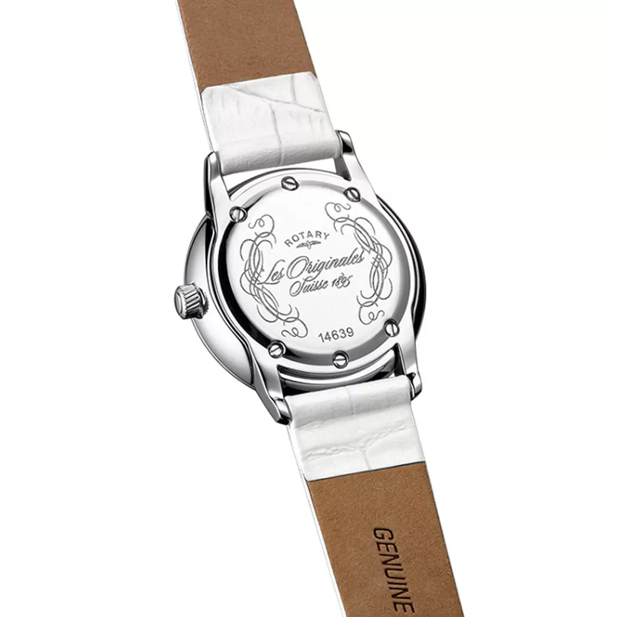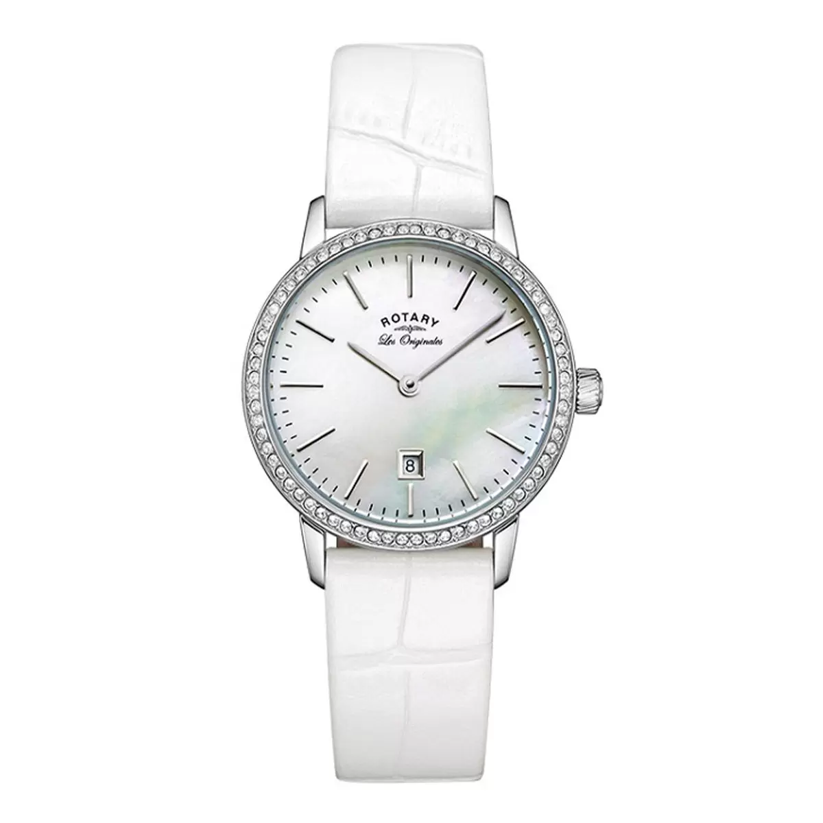 Elegant and timeless, the Rotary Les Originales Ladies Watch LS90050/07 is a refined accessory designed for sophisticated style. Crafted to Rotary’s exacting standards, this Swiss Made timepiece features a stunning white mother-of-pearl dial that beautifully reflects light, paired with a soft white leather strap for a classic finish. The sleek two-hand analogue display with minimalist baton indices enhances its understated elegance, while a crystal-set bezel adds a touch of luxury. A convenient date window at 6 o’clock ensures practicality without compromising style. Built with a durable stainless steel case and scratch-resistant sapphire glass, this watch is designed for both everyday wear and special occasions. Water resistant up to 50 metres, it offers reliability alongside its elegant design. Supplied brand new in original Rotary packaging with warranty and instructions.