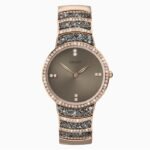 - The grey sunray dial takes on a simplistic layout. There are Swarovski crystal stones set at 12, 3, 6 and 9 o’clock around the edge of the dial and a polished rose gold leaf-style handset in the middle. The Seksy logo is presented in black beneath the 12 o’clock mark.