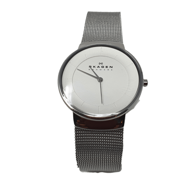 This Ladies Skagen Klassik watch has a stainless steel case and is powered by a quartz movement. It is fastened with a silver metal bracelet and has a white dial.