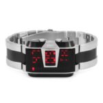This futuristic inspired watch is made from slate ion plated brushed stainless steel with red LED lights.