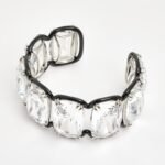 This bracelet cuff is crafted from a row of clear, oversized cushion cut crystals, artfully set on a black sculptural frame that gives the stones the illusion of floating, celebrating the magic and geometry of Swarovski crystals in their purest form. Wear it on a bare wrist, or over the top of a long sleeve, to make a statement that is uniquely chic. This cuff is part of the Harmonia family, designed by Creative Director Giovanna Engelbert for Collection I.