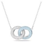 Express yourself with this dazzling necklace. Featuring interlocking circles in clear and aquamarine pavé, it is finished with a sleek rhodium plated setting. Layer yours with other designs from the Stone family for easy elegance.