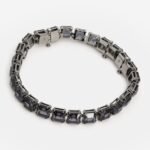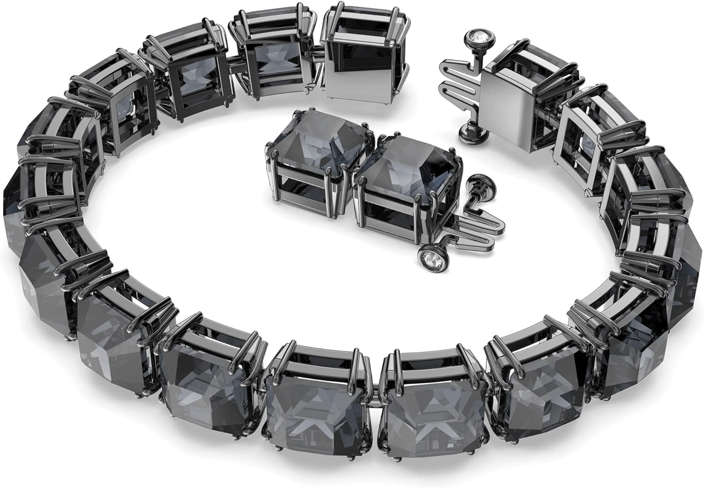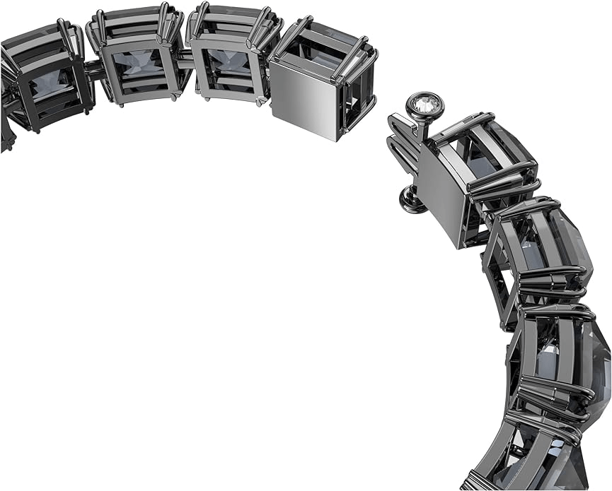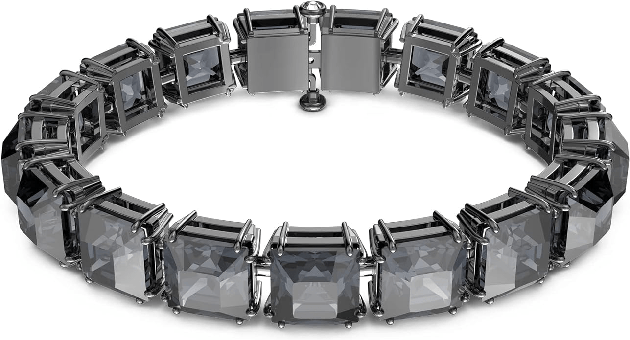 This striking bracelet defines everyday elegance with an edge. Featuring square-cut crystals in a bold, graphite hue, it’s expertly finished with a sleek, rhodium-plated setting. Intended to be genderless, wear yours solo as the ultimate punctuation for any look – or stack it with other designs from the Millennia family. This bracelet is part of the Millenia family, designed by Creative Director Giovanna Engelbert for Collection II. How to close and open it: slide the hooks into the corresponding holes at the base of the end stone and push to click into place. To open, unfasten the security chain and press the buttons on either side of the stone at the same time to release the hooks.