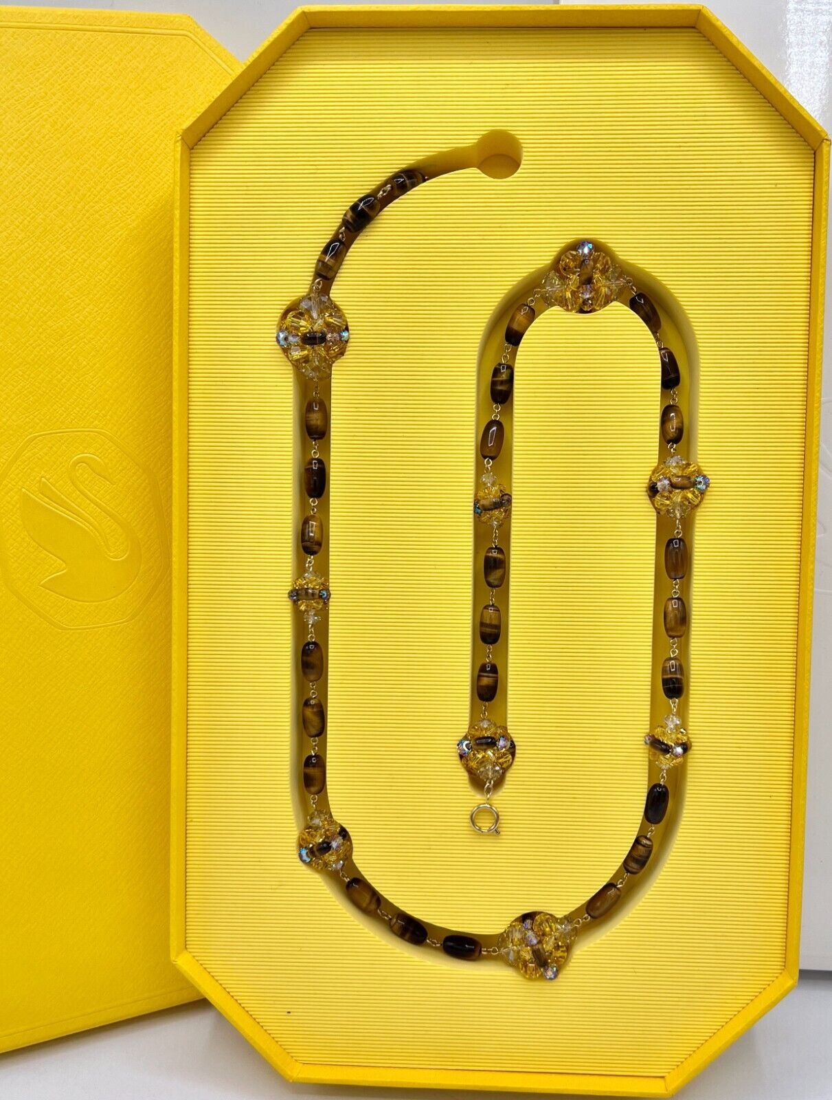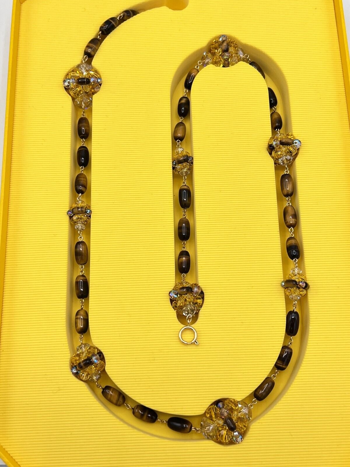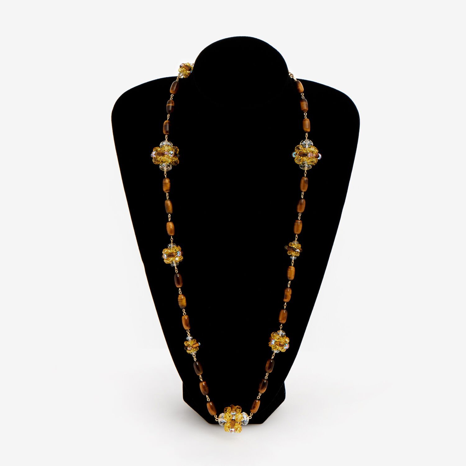 Inspired by bohemian bead work, this necklace is formed from clusters of earthy toned crystals and lustrous tiger eye beads. Layer yours with other designs from the Somnia family, or let it stand alone against a simple tank or T-shirt for a more subtle statement. This necklace is part of the Somnia family, designed by Creative Director Giovanna Engelbert for Collection I.