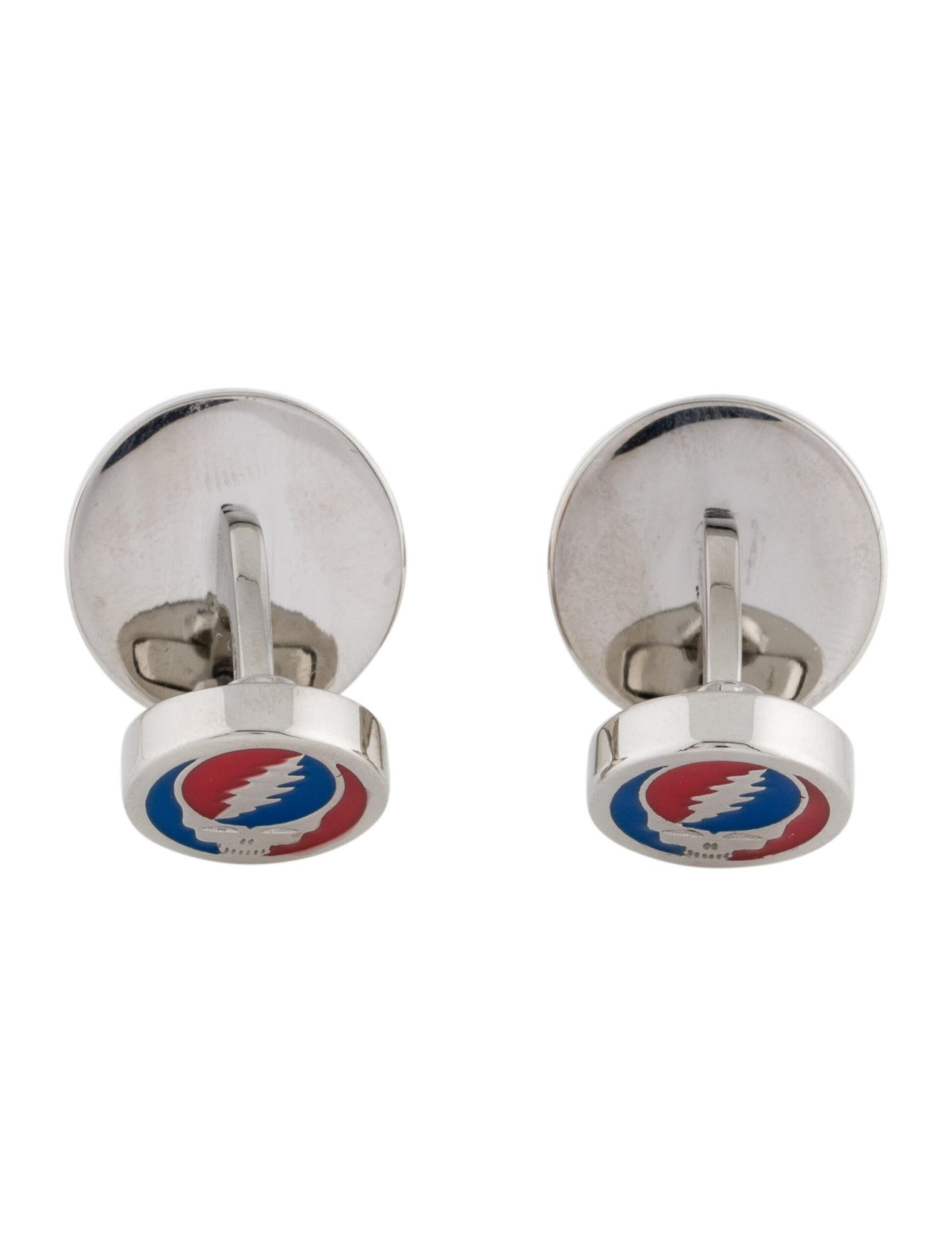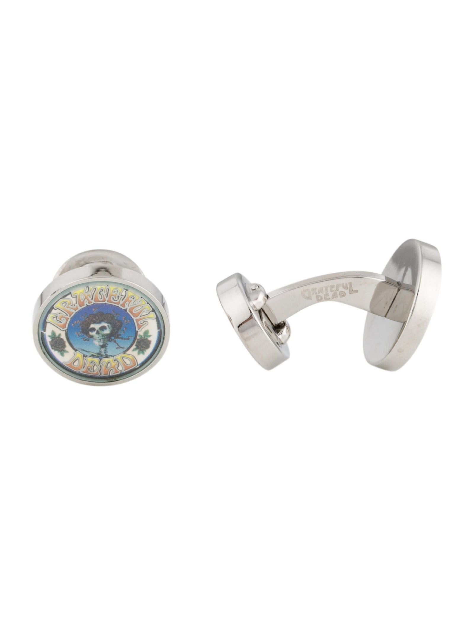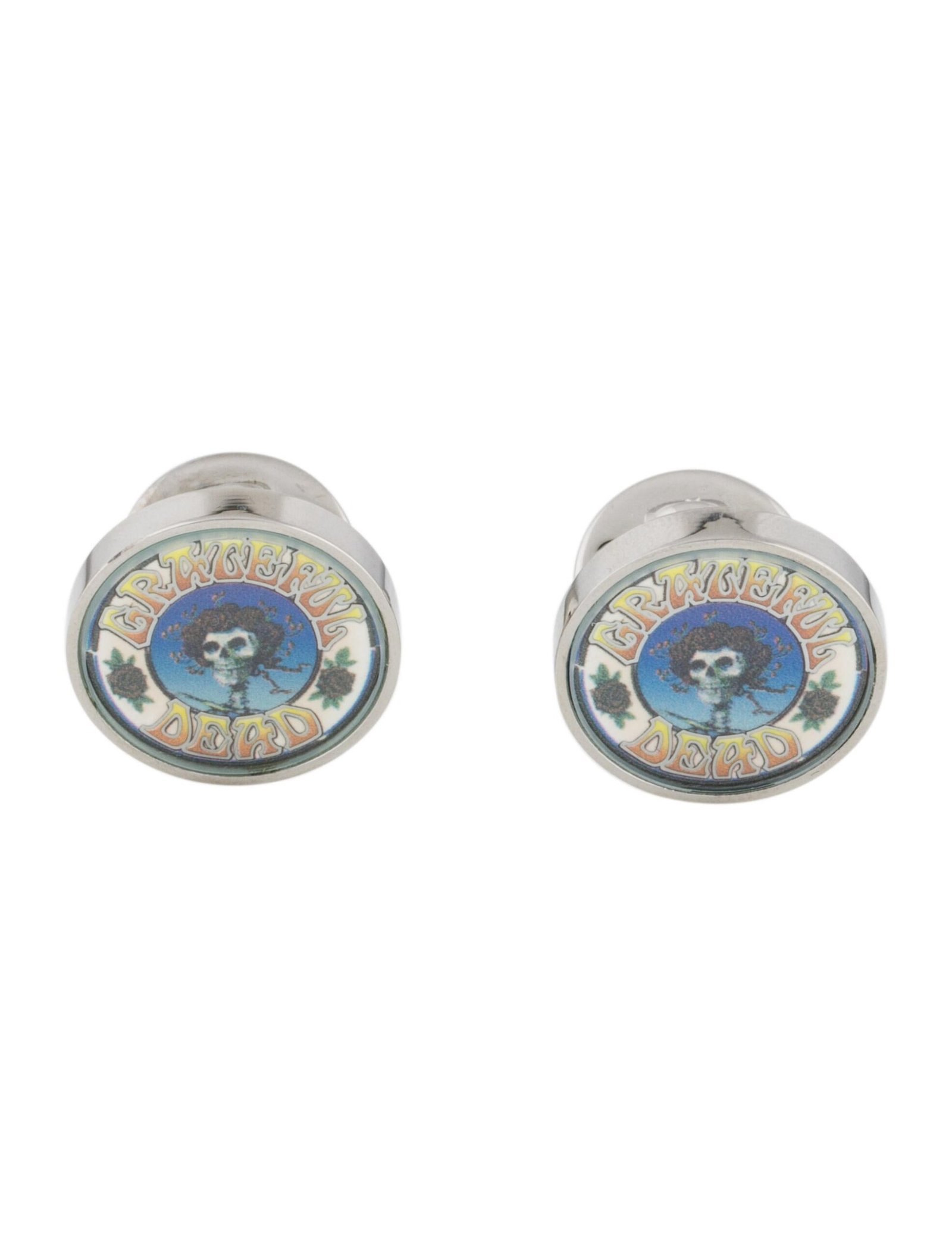 Add a touch of iconic rock heritage to your formalwear with these striking Tateossian Grateful Dead cufflinks. Expertly crafted in a high-polish silver-tone finish, these cufflinks feature distinctive round motifs showcasing the legendary Grateful Dead design in vibrant enamel. Designed for both style and durability, they include a classic toggle closure for secure wear. Perfect for collectors, music enthusiasts, or anyone looking to elevate their outfit with a unique statement accessory. Presented in an official Tateossian designer box, these cufflinks also make an excellent gift.