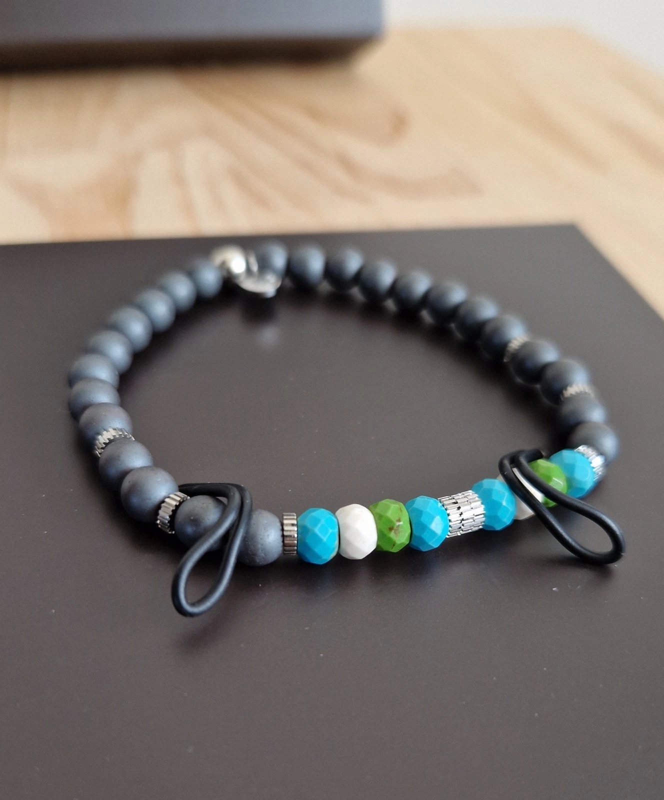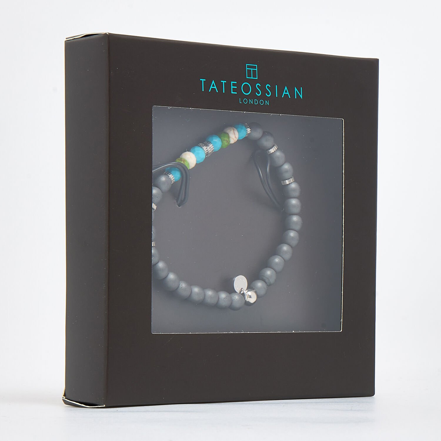 Add a refined designer touch to your look with this Tateossian multicoloured hematite and howlite bracelet, expertly crafted with natural round beads and durable stainless steel hardware. This stylish beaded bracelet features 6mm round hematite and howlite stones, accented with Tateossian’s signature gear disc and RT tag, giving it a distinctive luxury finish. Designed to fit up to a medium wrist (approx. 17.5cm), it is both comfortable and versatile—perfect for everyday wear or special occasions. Presented in its original Tateossian box, this bracelet makes an excellent gift or a premium addition to any jewellery collection.