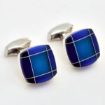 Immerse yourself in the artistry of these cufflinks, where each fiber optic glass is chosen and shaped with care to ensure the highest visual impact. The play of blue and navy blue hues adds a touch of sophistication to your ensemble, perfect for both formal occasions and business settings. The checked motifs lend a touch of traditional charm, while the logo detail discreetly signifies your appreciation for quality and design.