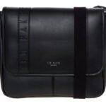 Ted Baker ‘Hyee’ messenger bag made from synthetic black leather. Fold-over construction with magnetic closure. Lined internal compartment with additional slip pocket inside. Integrated Connected charger pocket. Adjustable shoulder strap. Tonal debossed branding and subtle brand lettering.
