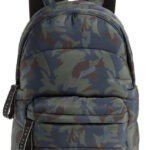 Puffer backpack, camouflaged print, recycled polyester, branded, straps, pouch, zip closure, zip pocket.