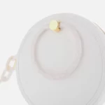 Circular Ted Baker with woven straw detailing to each side and a tonal white leather trim. The ‘Agneti’ bag is designed with white resin hoop handles and an adjustable strap for cross body or over the shoulder styling. The zip fastened main compartment is fully lined and features a zip pocket. Finished with resin chain detail on the shoulder strap and gold-tone ‘T’ detail to the front.