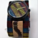 - Presented on a brown leather strap that’s then placed on to a thicker multi-coloured fabric strap