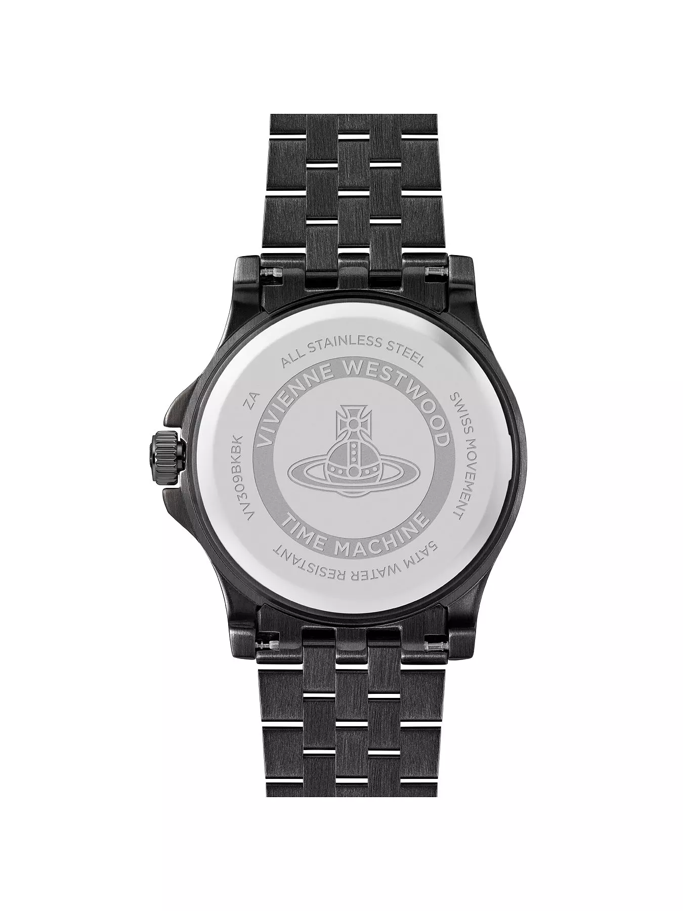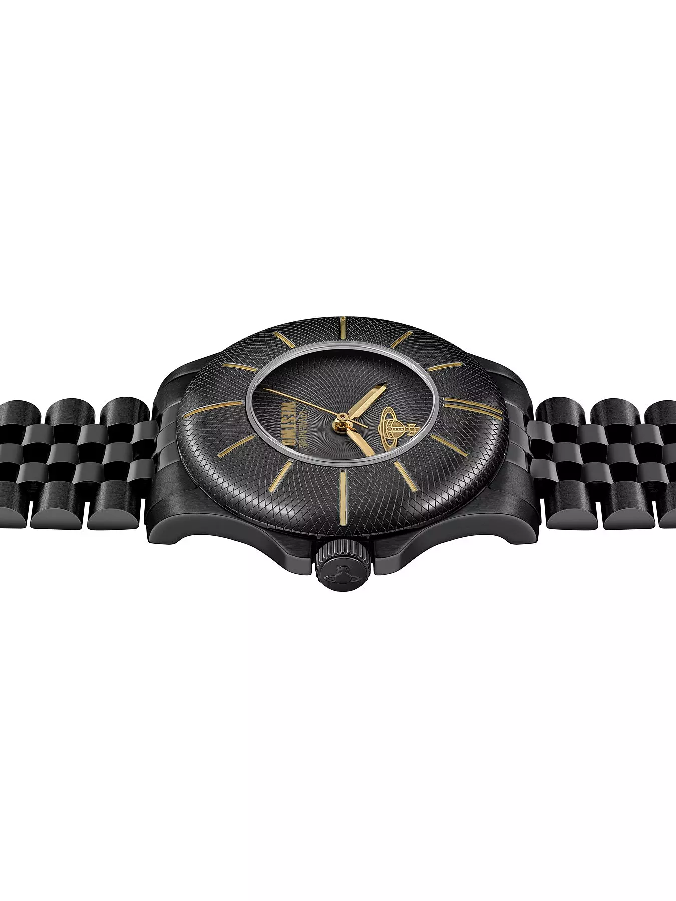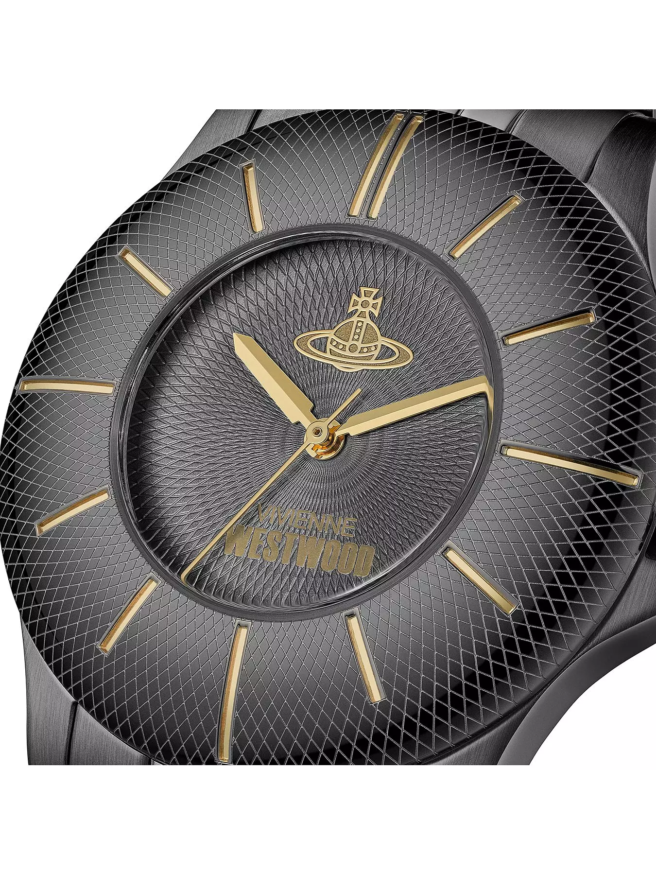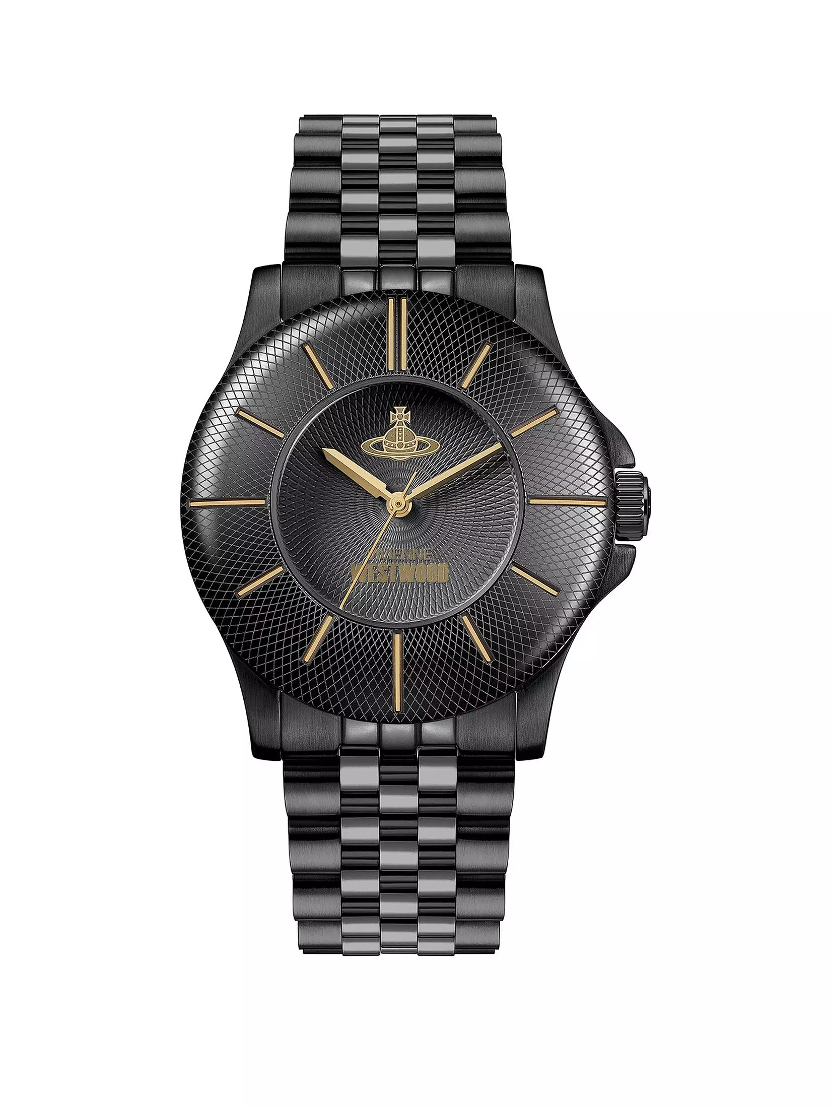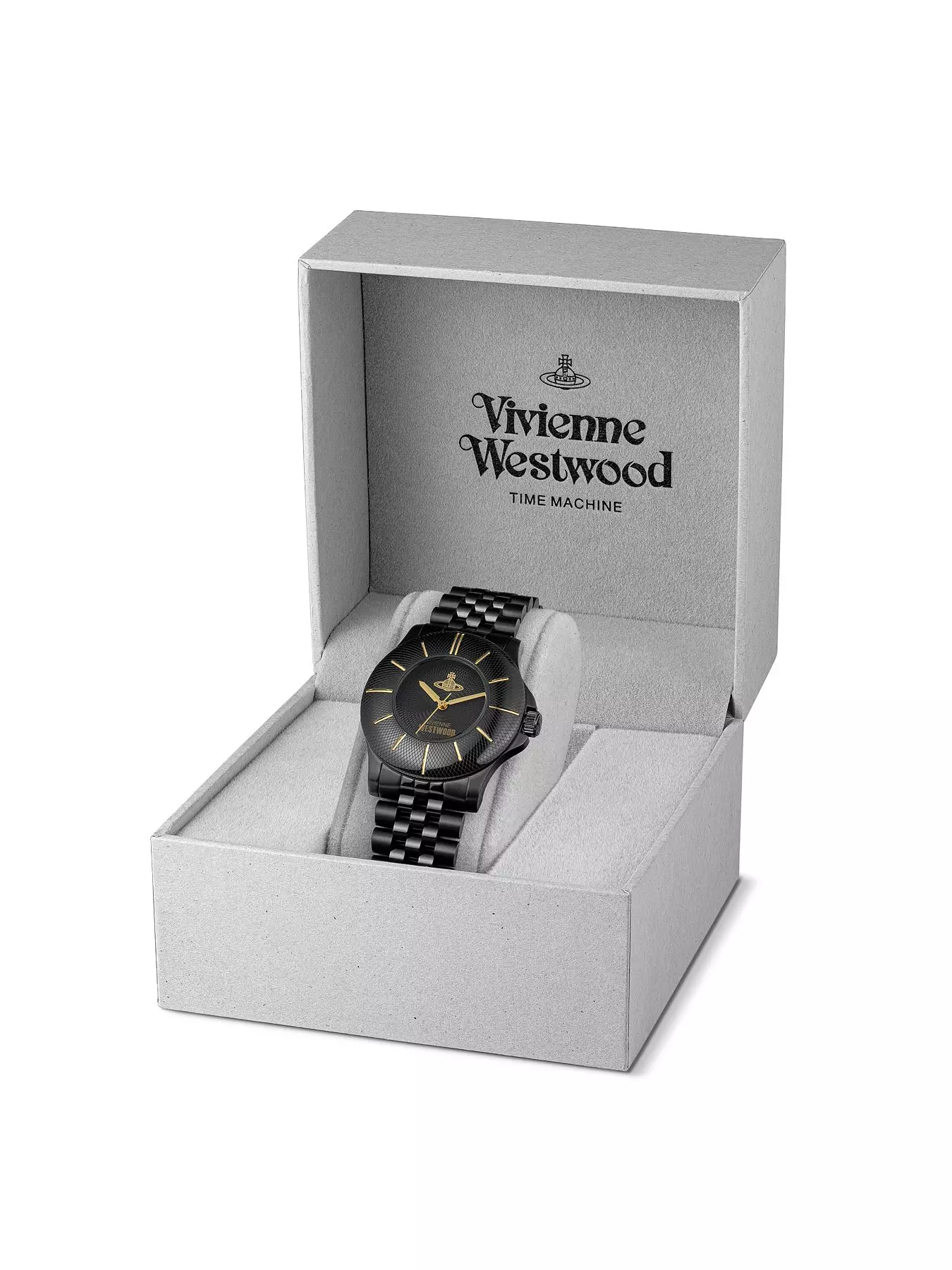 A bold and sophisticated timepiece, the Vivienne Westwood Walbrook watch perfectly blends luxury with contemporary design. Crafted with a sleek black-tone stainless steel case and bracelet, this elegant watch features a striking black dial adorned with the iconic Vivienne Westwood orb logo for a signature designer finish. Powered by a precise quartz movement, it ensures accurate and reliable timekeeping for everyday wear. The durable mineral crystal glass protects the dial, while the push button deployment clasp offers secure and comfortable wear. With 50 metres water resistance, this watch is both practical and stylish—ideal for those who appreciate modern elegance with an edgy twist. Perfect for both casual and formal occasions, this designer timepiece makes an excellent gift or a standout addition to any watch collection.